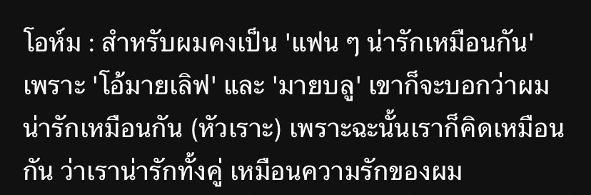โอห์ม : สำหรับผมคงเป็น 'แฟน ๆ น่ารักเหมือนกัน' เพราะ 'โอ้มายเลิฟ' และ 'มายบลู' เขาก็จะบอกว่าผมน่ารักเหมือนกัน (หัวเราะ) เพราะฉะนั้นเราก็คิดเหมือน
