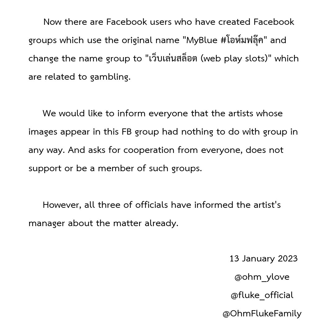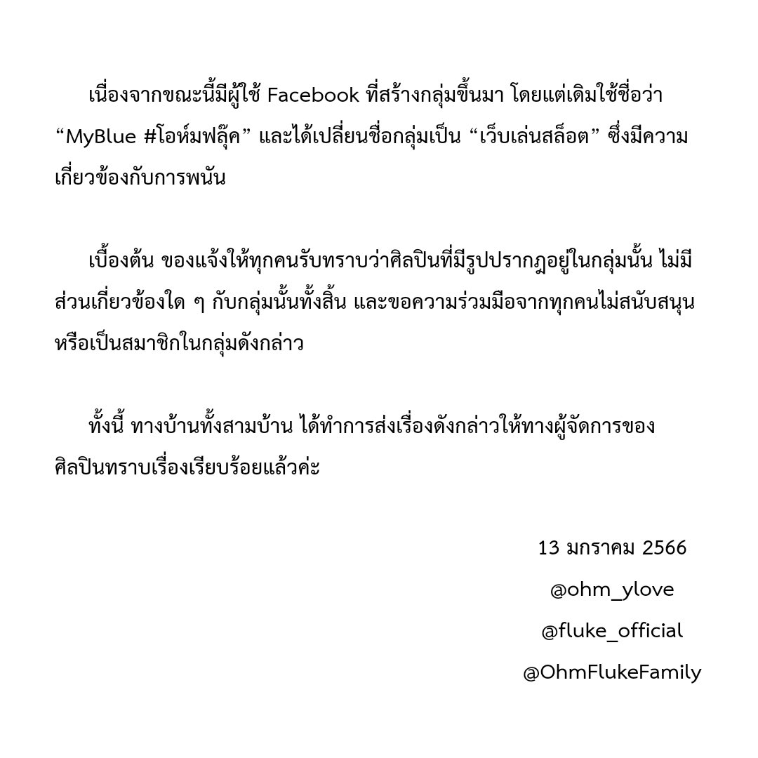 เนื่องจากขณะนี้มีผู้ใช้ Facebook ที่สร้างกลุ่มขึ้นมา โดยแต่เดิมใช้ชื่อว่า “MyBlue #.โอห์มฟลุ๊ค” และได้เปลี่ยนชื่อกลุ่มเป็น “เว็บเล่นสล็อต” ซึ่งมีความเกี่ยวข้องกับการพนัน...