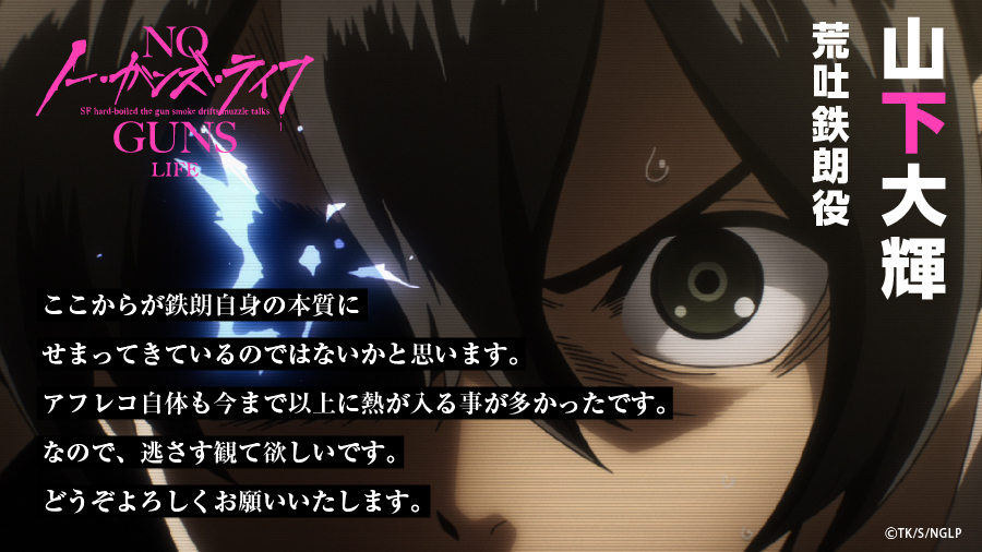 本日4/9、TVアニメ『ノー・ガンズ・ライフ』は、TBSにて25:28から第1話「暴走拡張者」の再放送をお送りさせていただきます。誠に申し訳ございませんが、何卒宜しくお願い申し上げます。 #ノーガンズ