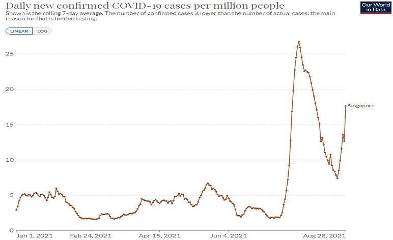 シンガポールでは、ワクチンの接種率が80%になったがやっぱり感染が止まらなかった。イスラエルと同じ現象が発生している。