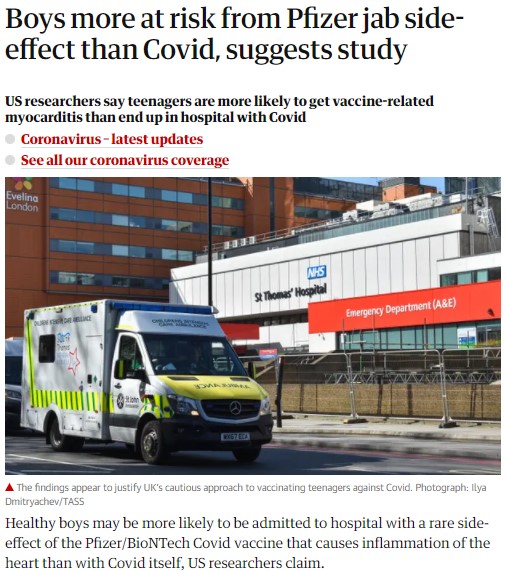 米国で10代の若者にとってコロナで入院する確率よりもファイザー社のワクチンで心筋炎になる確率が最大6倍程度高いという研究結果が発表された