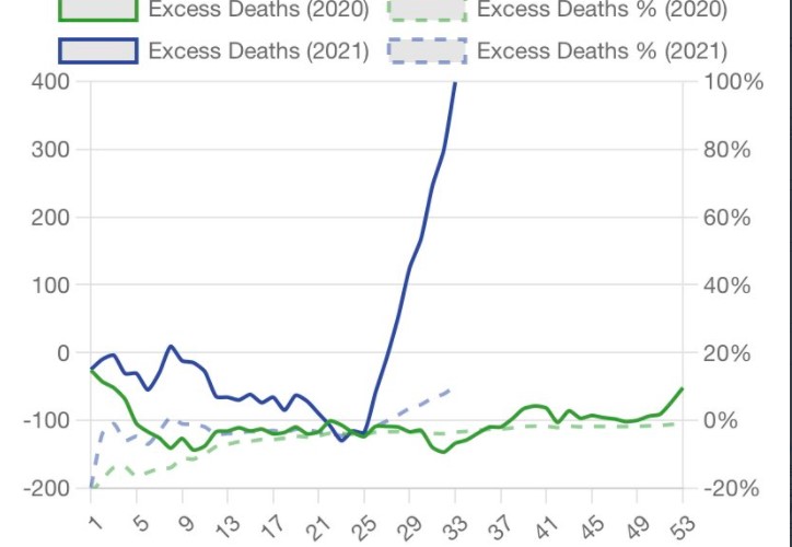 ワクチンの接種率が60%を超えた今では、1日の感染者数が3000人を超えるほどに大成長して注目を集めています。死者も2→992人に大躍進です