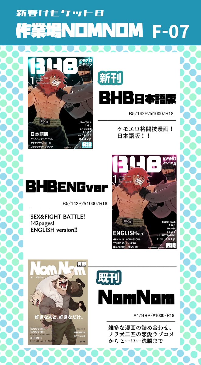 【新春けもケット8】作業場NOMNOMのおしながきできました:)142ページのケモエロ格闘技漫画、日本語版と英語版できました!既刊も少しですが置く予定です。NEW COMIC COMING UP!! 142 pages!!!Will have oversea shipping on alicebooks ;D #新春けもケット8 #pixiv pixiv.net/artworks/95541…
