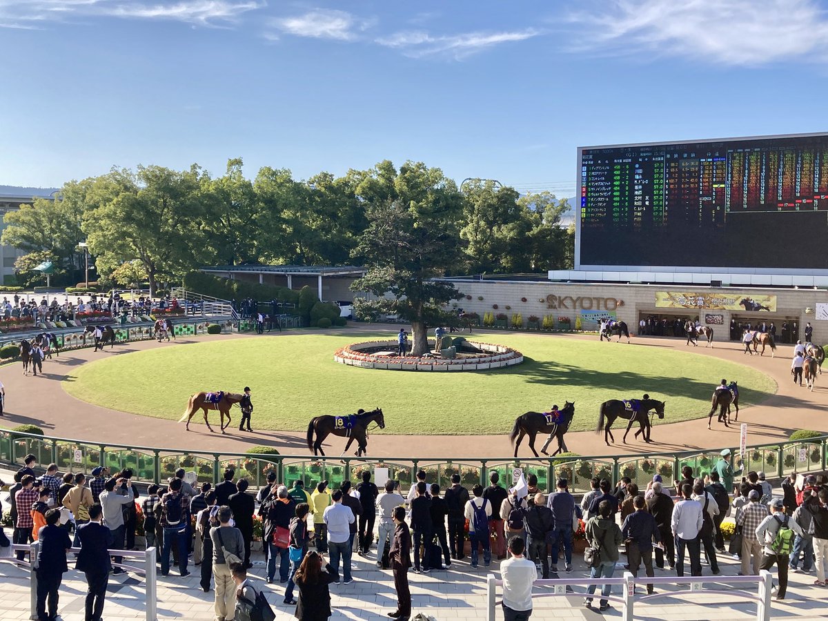 京都競馬場の丸型パドックで最後の周回が終わりました。