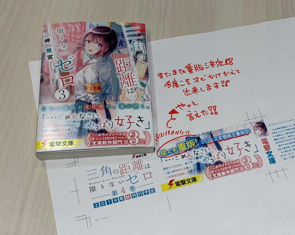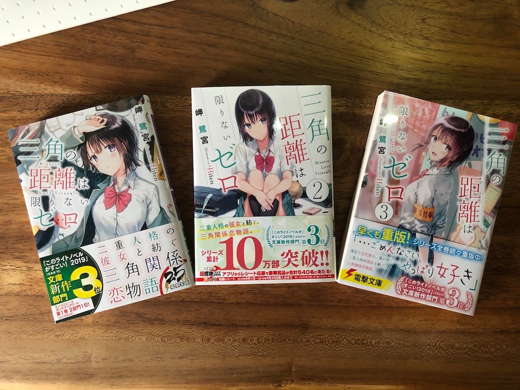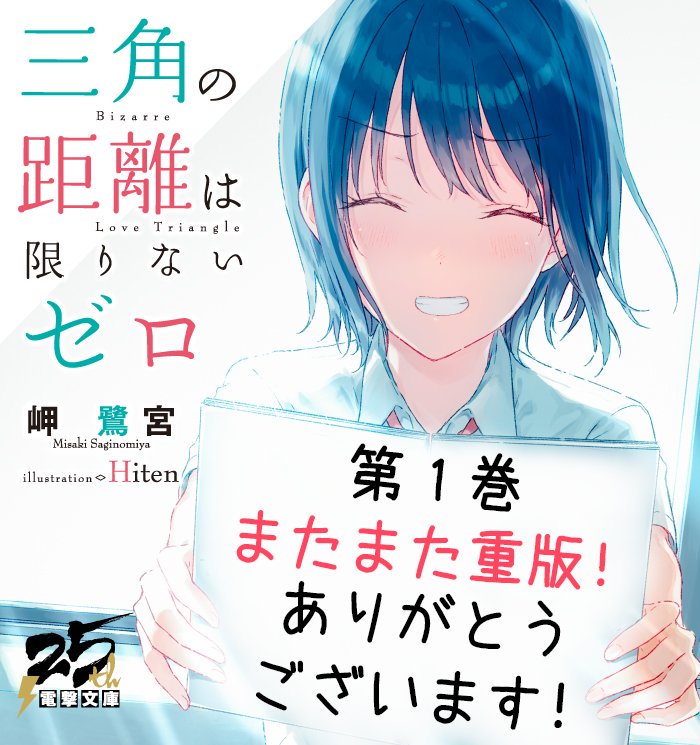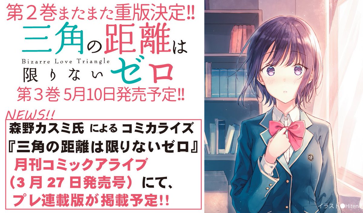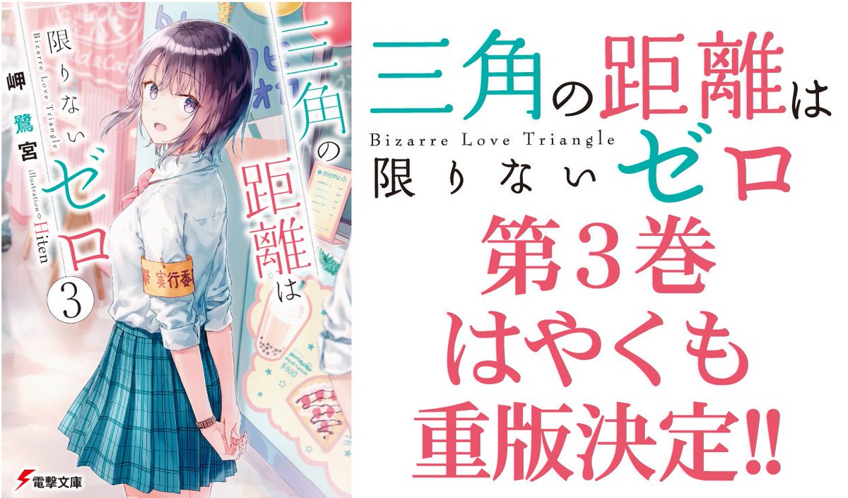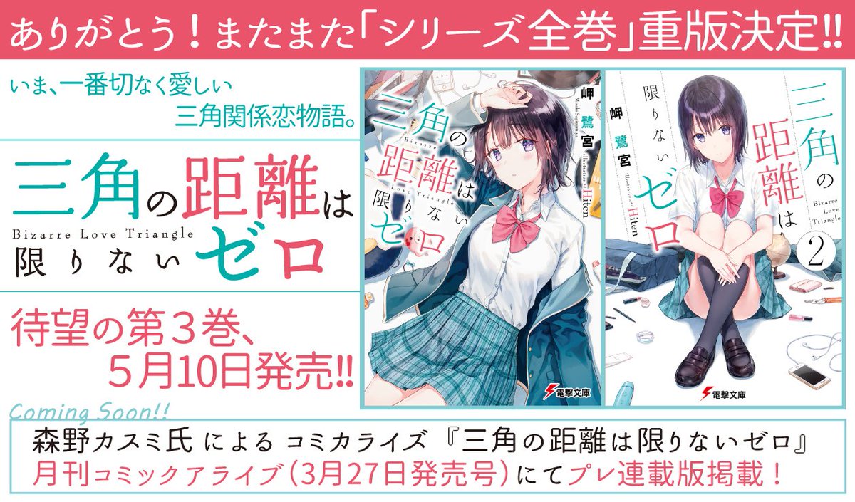 【ご報告】『三角の距離は限りないゼロ』が、シリーズ全巻重版となりました。応援本当にありがとうございます!原作3巻は5月10日発売。コミカライズはプレ連載版がコミックアライブ3/27発売号に掲載となります。どちらもどうぞお楽しみに。dengekibunko.jp/special/zeroky…