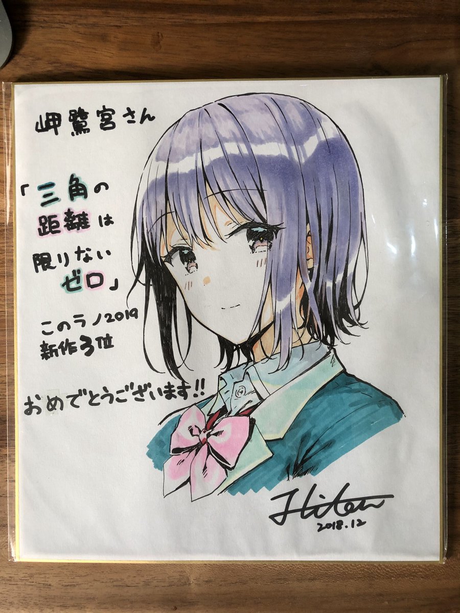 『三角の距離は限りないゼロ』のイラストを担当下さっているHitenさん(@HitenKei )からこのような色紙を頂きました!すごくすごくうれしい……ありがとうございます!