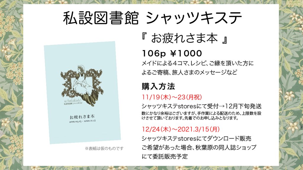 私設図書館カフェシャッツキステは2020年11月15日に閉館致しました。物語のあとがきとして、14年間の思い出をこめた同人誌を最後に発行致しました。2021年3月15日頃まで販売しておりますので、よろしければお手にとって下さいませ。