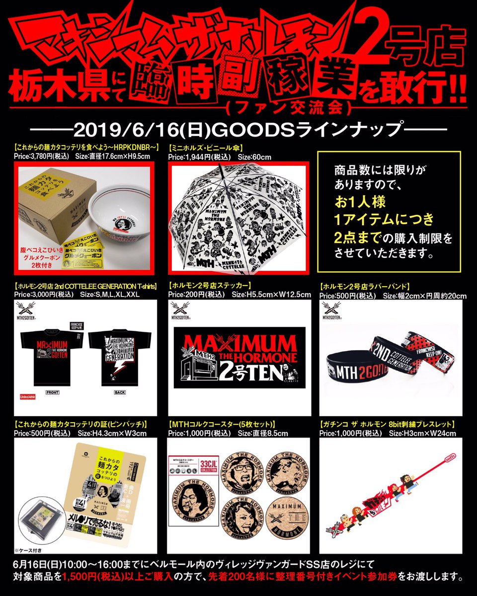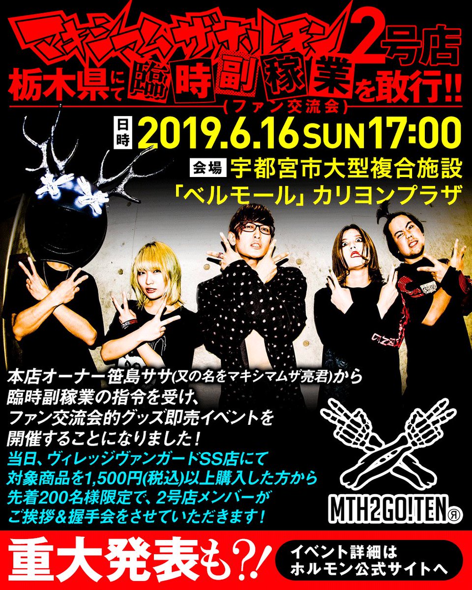 夏フェス出演も続々と決定中のホルモン2号店。本店オーナー笹島ササ(又の名をマキシマムザ亮君)から臨時副稼業の指令を受け、栃木の大型複合施設「ベルモール」ヴィレヴァンSS店にて、ファン交流会的グッズ即売イベント開催決定!