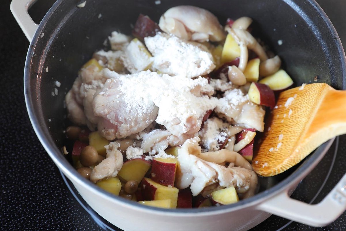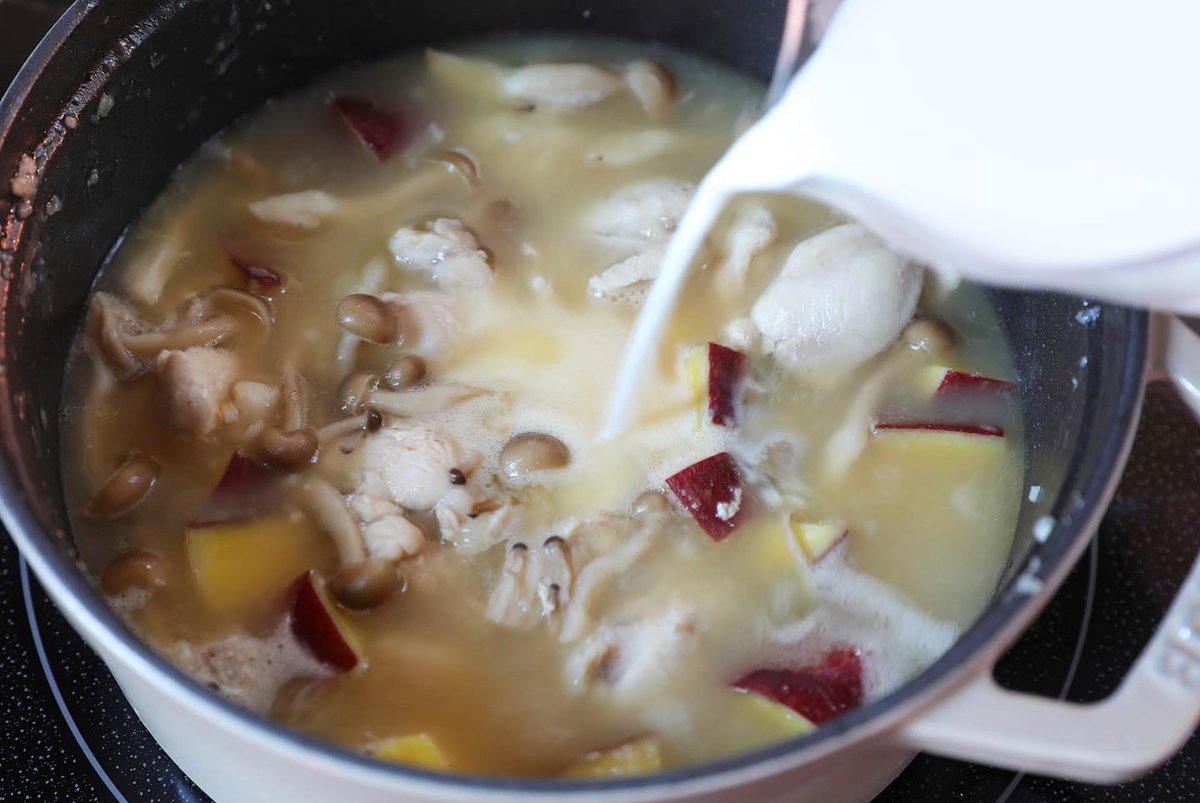 寒い時期にたくさん楽しんどきたい味!! やさしいミルクが体に染み渡る・・ 【さつまいもと鶏肉のミルクスープ】 さつまいもレンチン。鍋にバター、にんにく香り出し。鶏肉を入れ、さつまいも、しめじ。小麦粉を加え水とコンソメを入れ煮る。牛乳も入れ塩、こしょう。 詳しいレシピ👇
