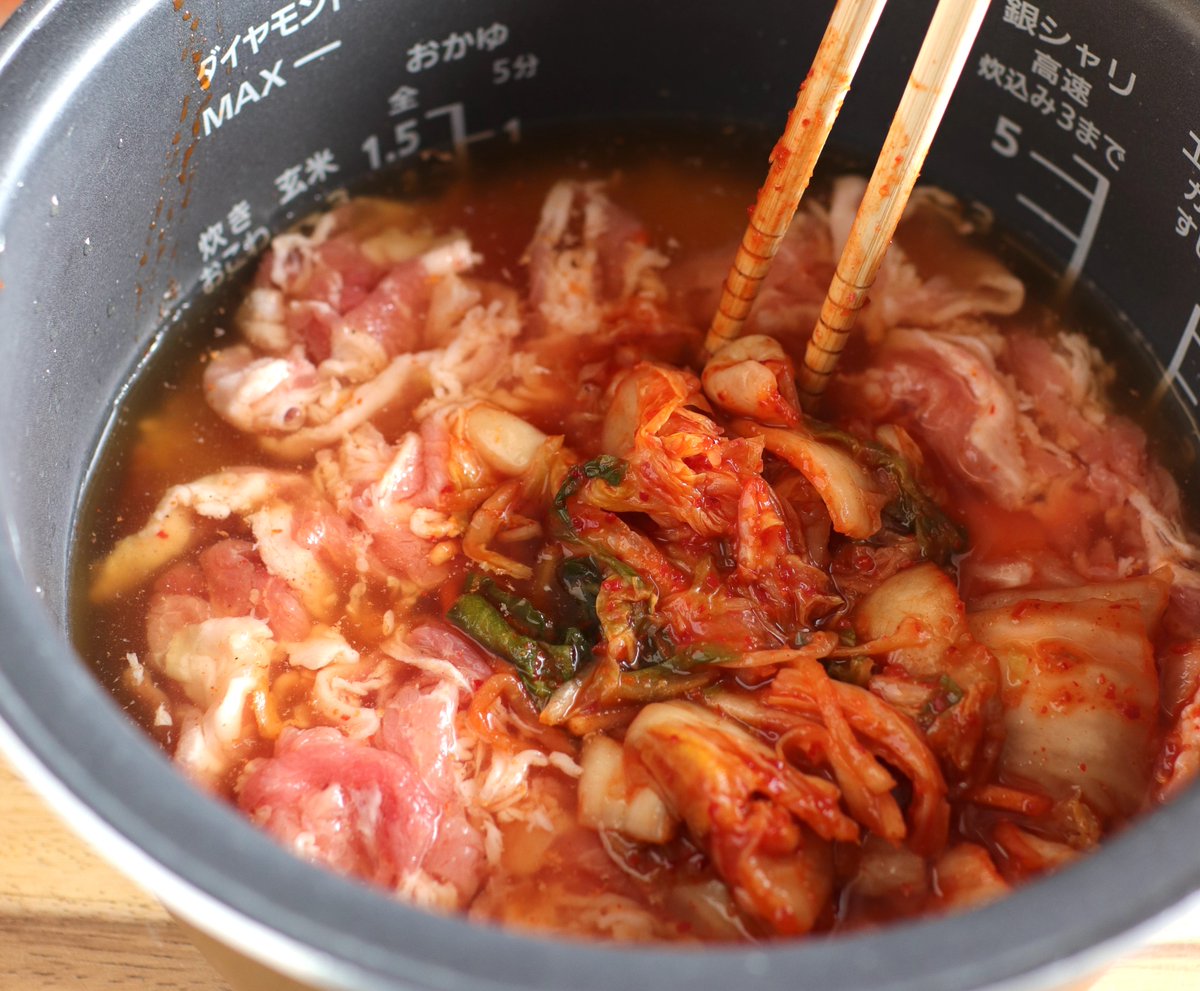 豚キムチのうまみがご飯に染み込んで 美味しくないわけないよね! 【豚キムチ炊き込みごはん】 豚バラに酒、キムチの汁をもみこみ、米を研いでしょうゆと鶏ガラスープを入れ、目盛より少なめに水。豚バラ、キムチを入れて炊飯。炊き上がりにごま油。 食べごたえたっぷり♪ 詳しいレシピ👇