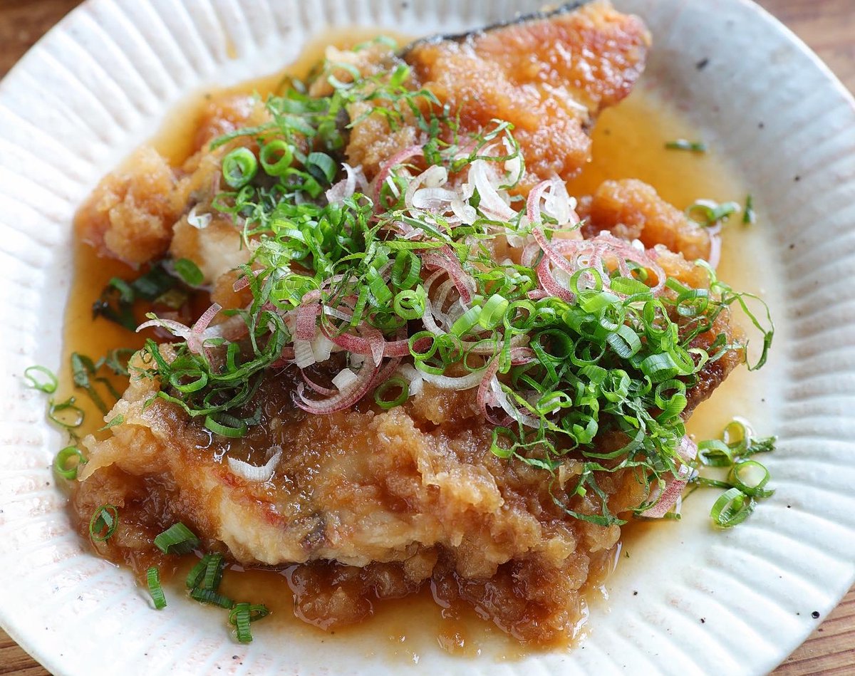 魚をさっぱり食べたい時に! どっさり薬味で食欲そそられる! 【ブリのさっぱり生姜おろしポン酢の薬味のせ】 ブリに塩・こしょう、薄力粉。フライパンに油、ブリ入れ両面焼く。 ボウルに大根おろし、ポン酢、しょうが。フライパンに入れ、絡める。皿に盛り、薬味。 生鮭でも◎ 詳しいレシピ👇