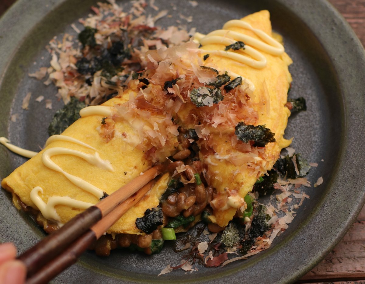 冷蔵庫にだいたい常備してるんじゃない? ごはんにも合いすぎる! 【納豆オムレツ】 卵に塩、マヨネーズを入れ溶く。フライパンで卵を半熟に焼き火を止め、納豆とネギをのせ卵をかぶせる。盛付け、マヨネーズ、かつお節、のり。 栄養満点♪チーズをいれても^^ 詳しいレシピ👇