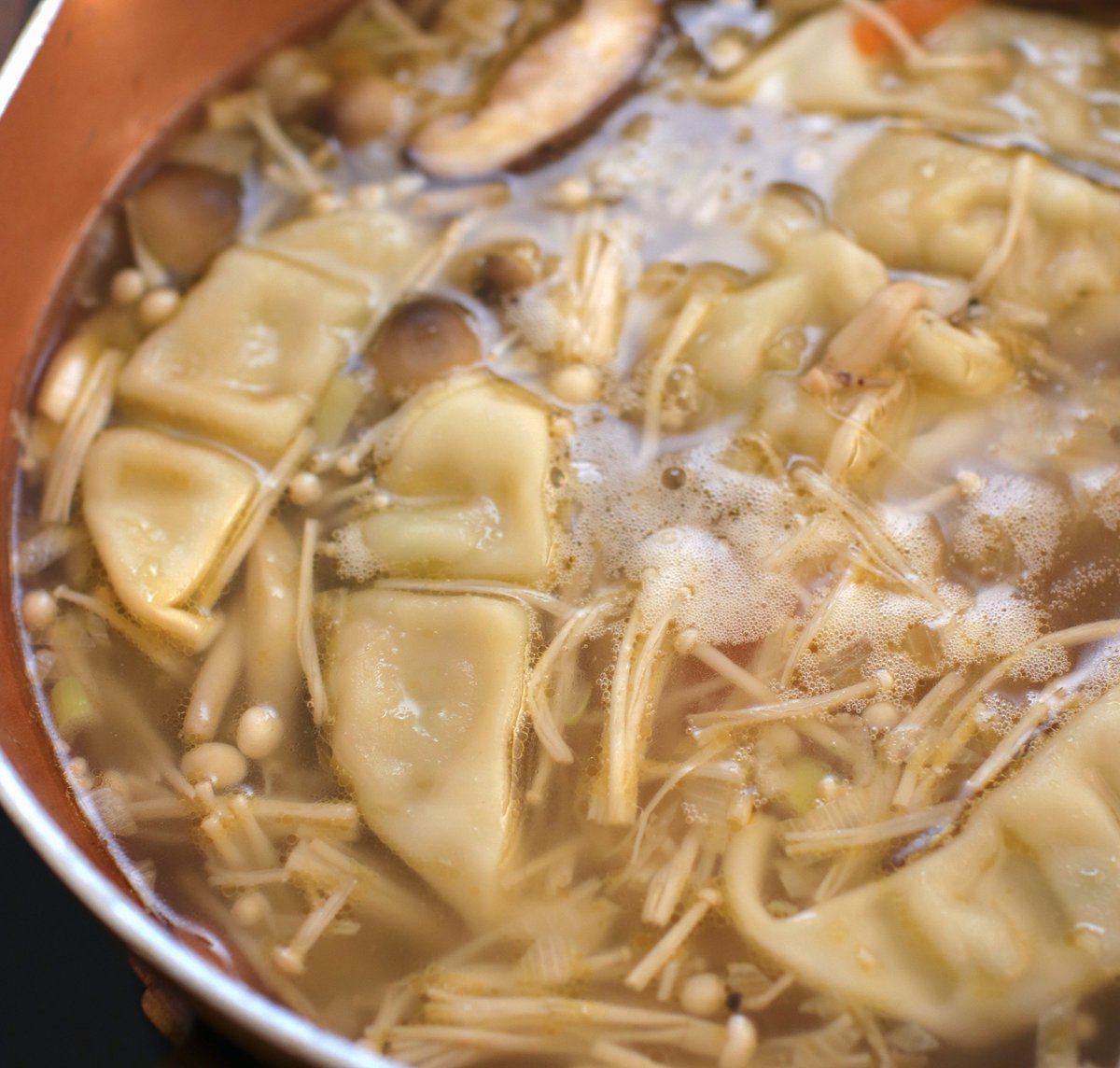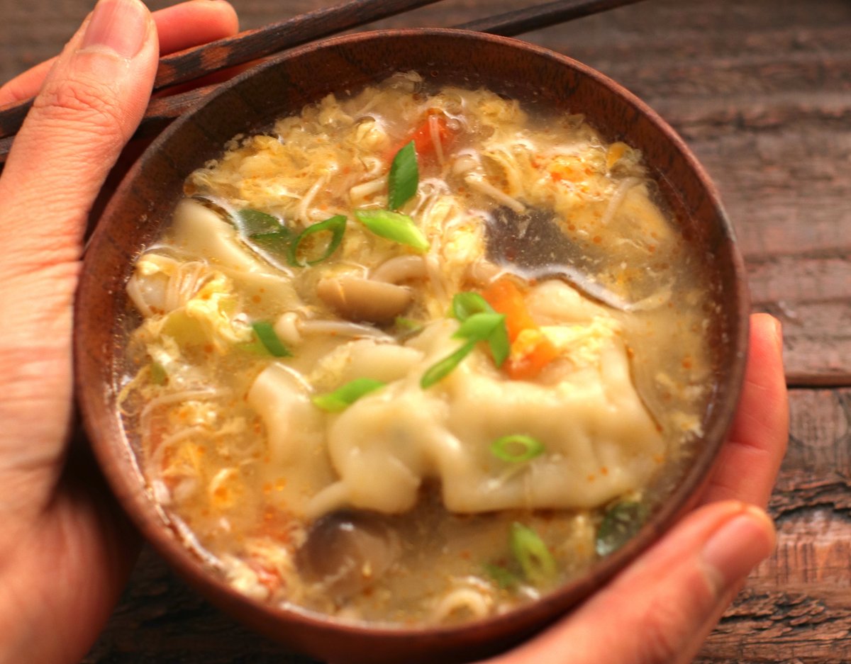 疲れた日はチルド餃子買ってきて! 今日はこれを焼かずにスープにするよ! 【市販の餃子で中華かき玉スープ】 ごま油で長ネギと生姜を炒めにんじん、きのこも。水、鶏がらスープの素、しょうゆ、餃子を入れ塩こしょう。水溶き片栗粉でとろみ、卵をかき玉に。ラー油を入れ器に盛る。 詳しいレシピ👇