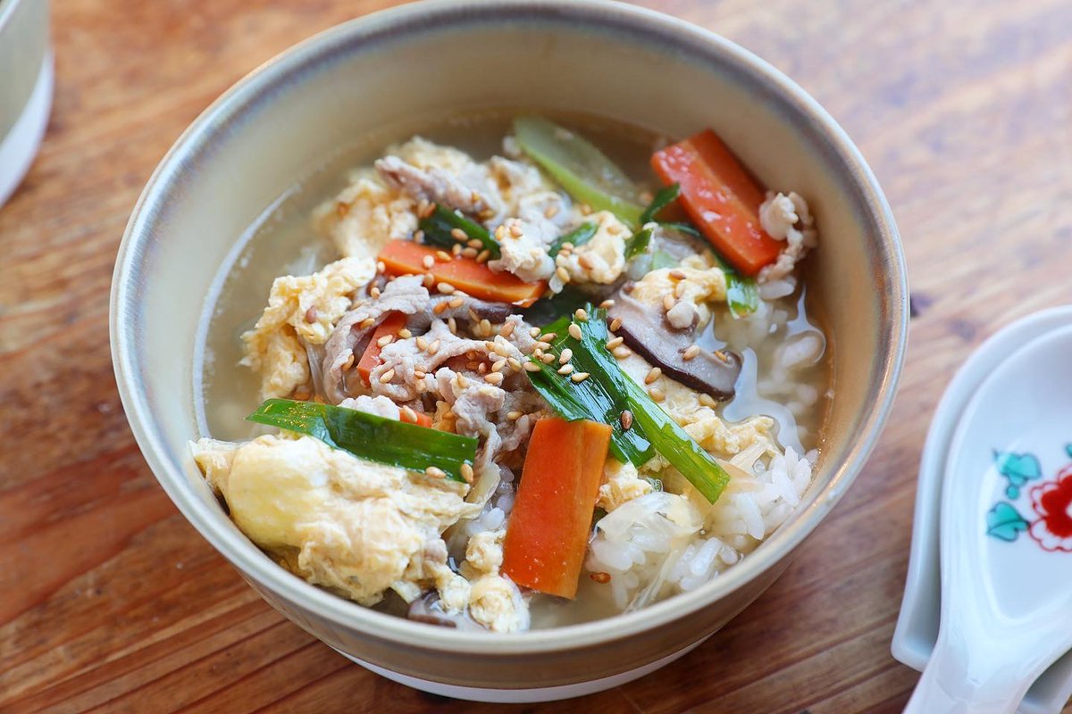 寒い日に食べたい!あったかくてほっこり♪ ひとりランチにもいいかも! 【豚肉とたまごのクッパ】 鍋にごま油、しょうが、豚肉。水を加え沸騰、にんじん、しいたけ。鶏がらスープの素、しょうゆ、しょうが加え、長ねぎ、にら、ごま油。溶き卵。器にごはん、スープ、ごま。 詳しいレシピ👇