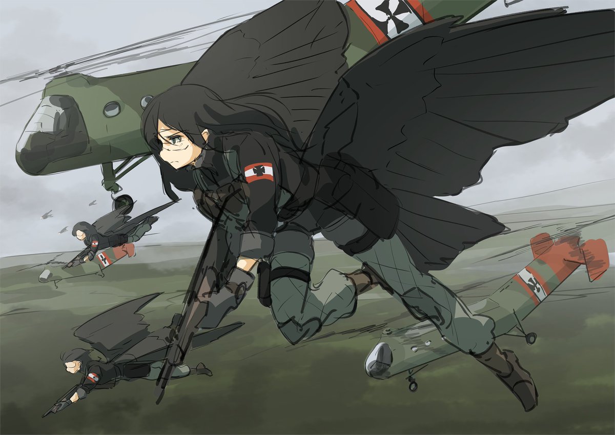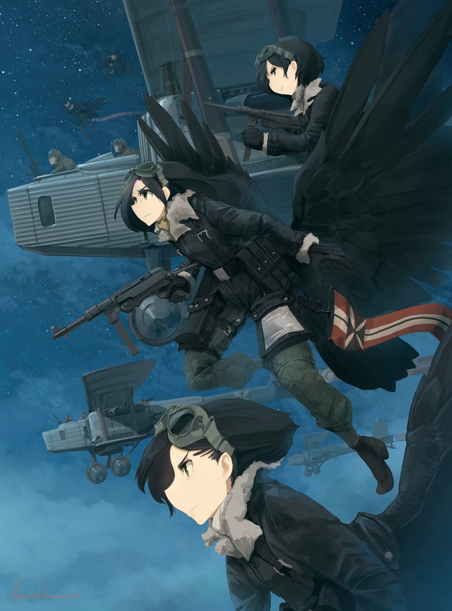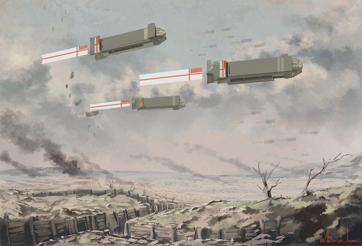 銃を持った翼人兵士の登場に脅威を覚えた人間達は、観測気球の武装化を最初に思いついた。以降、兵器開発には上空に陣地を設ける考えが付いて回る。塹壕戦が始まった頃には、上空から砲撃可能な飛行船まで登場し、中間地帯が伸びて戦線を膠着させた。 #Winged_Fusiliers