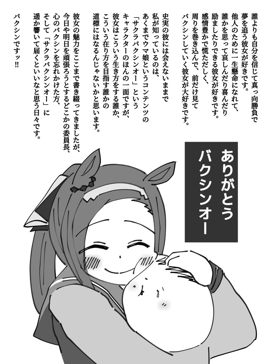 C101、初めてのサークル参加本当に楽しかったです! 新刊、初めて出した自分の同人誌からの一ページです。 サクラバクシンオーに、たくさんの「好き」に出会えて本当に嬉しく思います。 夢を叶えてくれたたくさんの方、本当にありがとうございました!