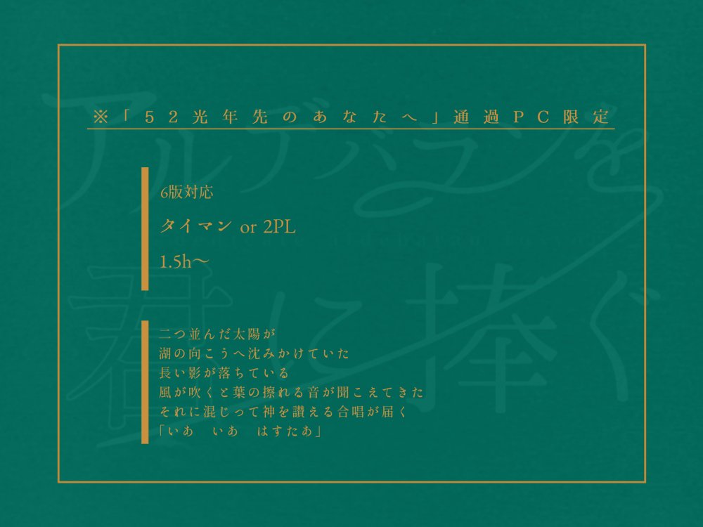 CoC『52光年先のあなたへ』♥2000超え記念に続編シナリオ『アルデバランを君に捧ぐ(booth.pm/ja/items/29289…)』を抽選で2名様にプレゼントします🎁