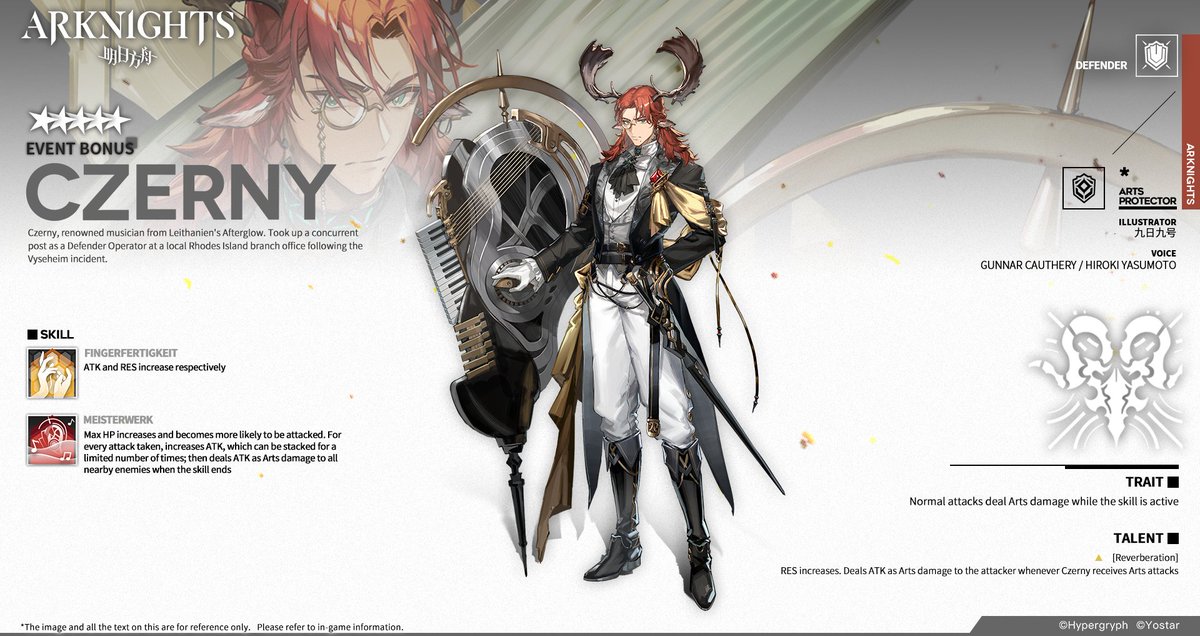 Czerny, renowned musician from Leithanien's Afterglow. Took up a concurrent post as a Defender Operator at a local Rhodes Island branch office following the Vyseheim incident.
