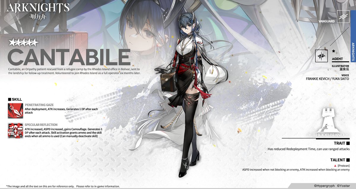 Cantabile was rescued from the slums by the Bolívar office of Rhodes Island and sent to the landship for further treatment. She was accepted into Rhodes Island as an operator six months later, at her own request.