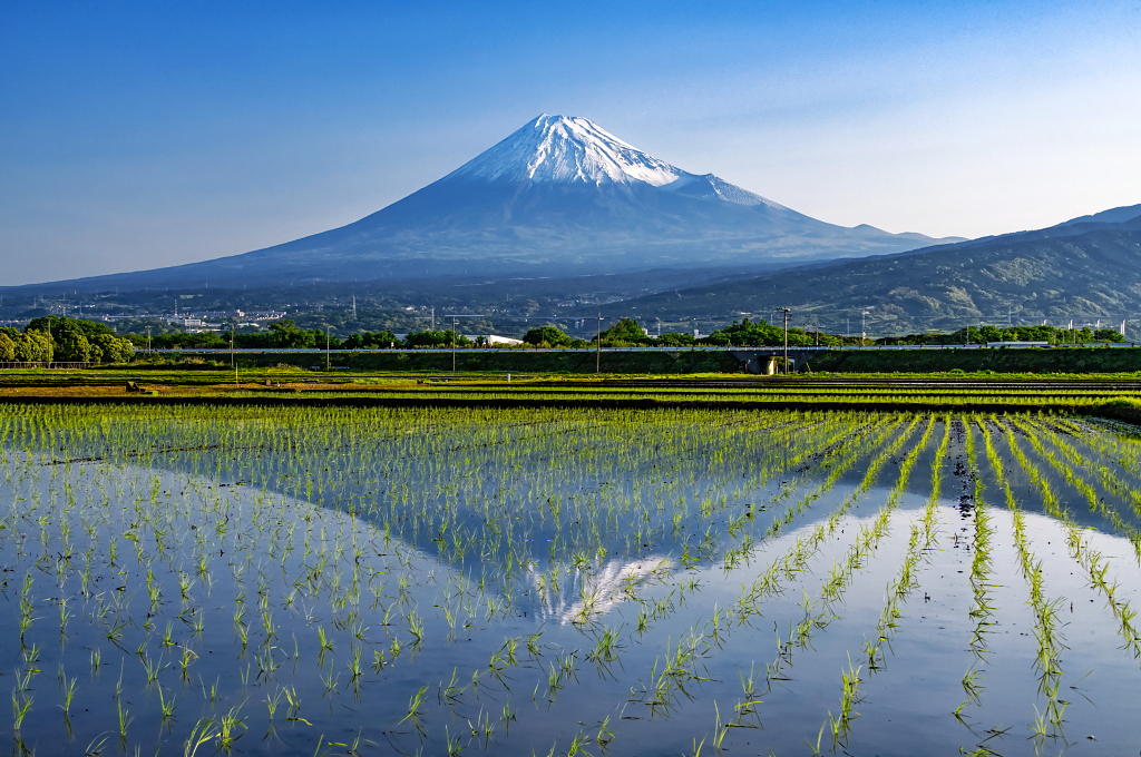 逆さ富士映る田園地帯を通過するドクターイエローです!