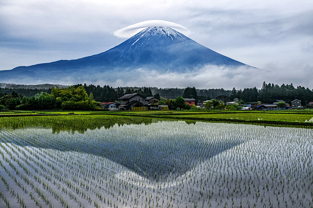 おはようございます。 山里の田園からの笠を被った富士山の風景です!