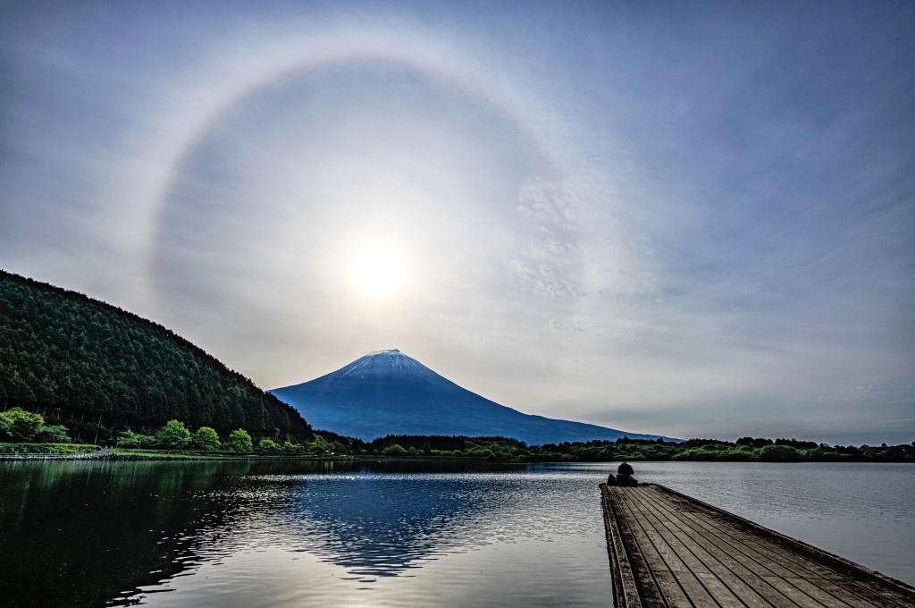 富士山の真上に昇る太陽と日暈の光景です!