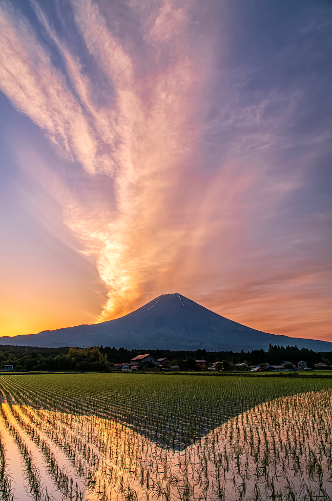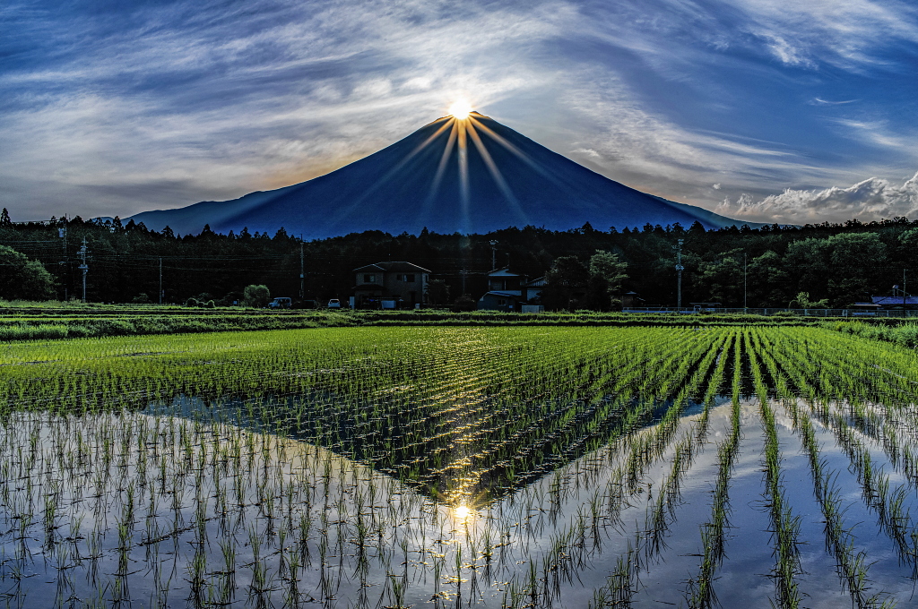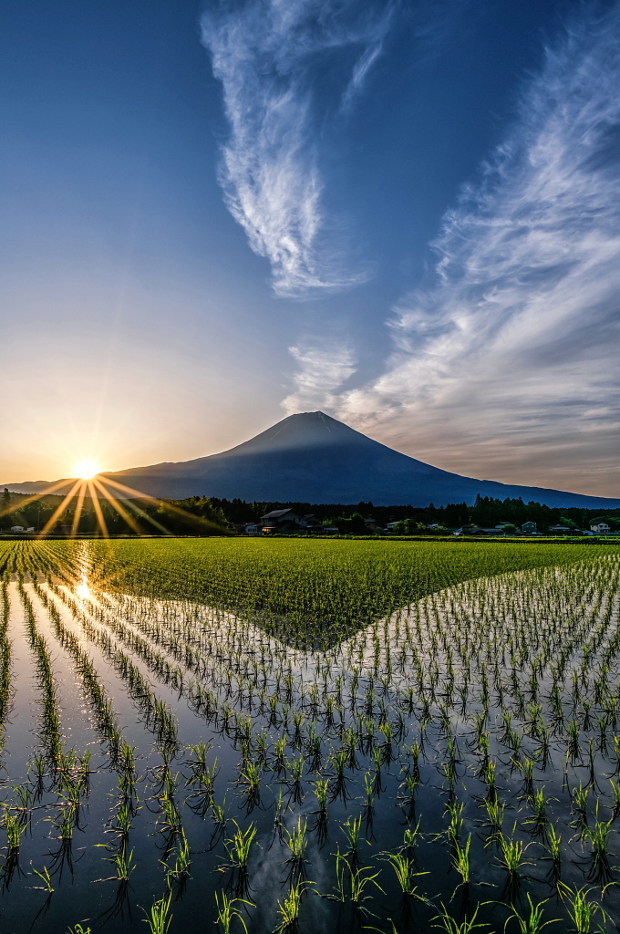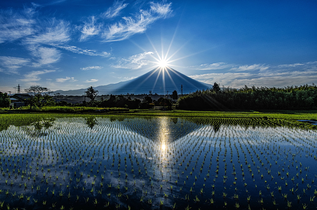おはようございます。 逆さ富士映る水田からのダイヤモンド富士と流れる薄雲の風景です!