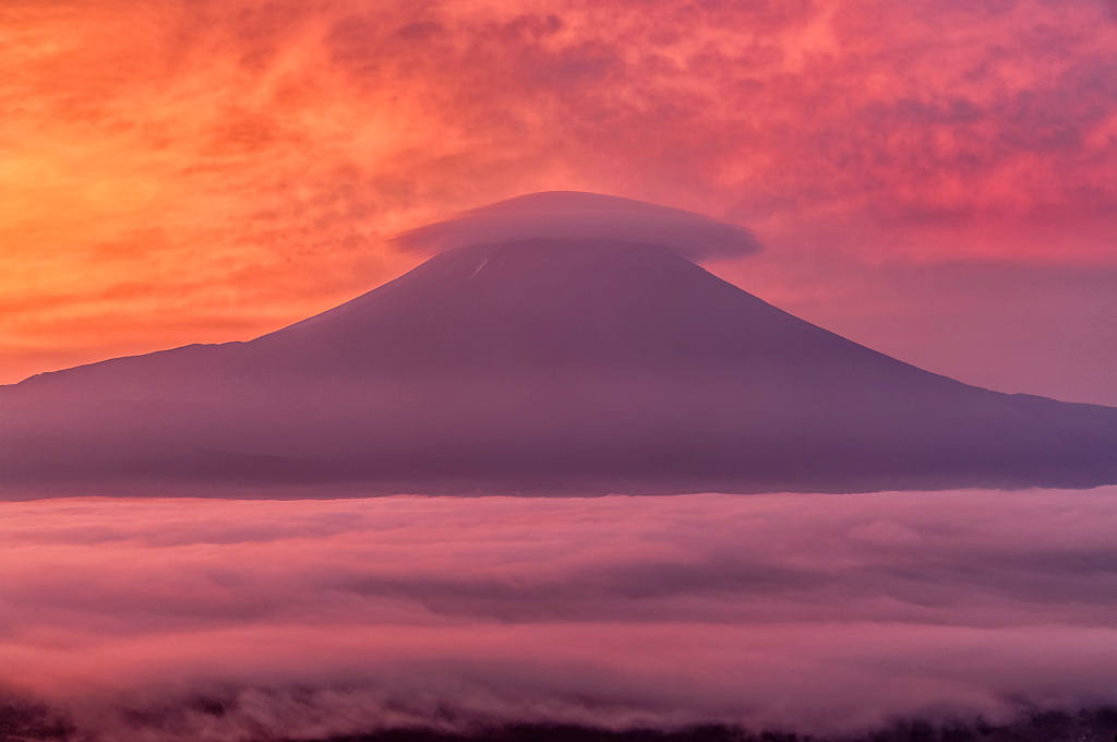 おはようございます。 燃えるような朝焼けと雲海に浮かぶ笠富士です!