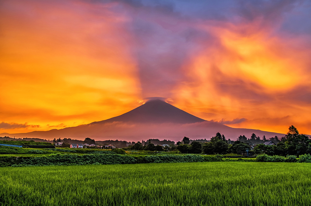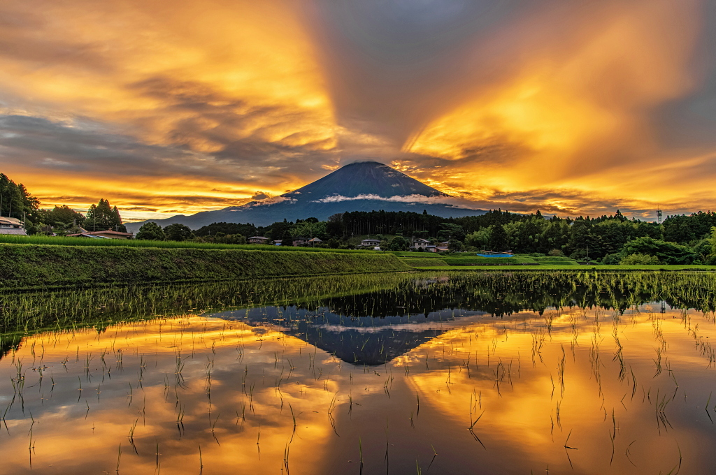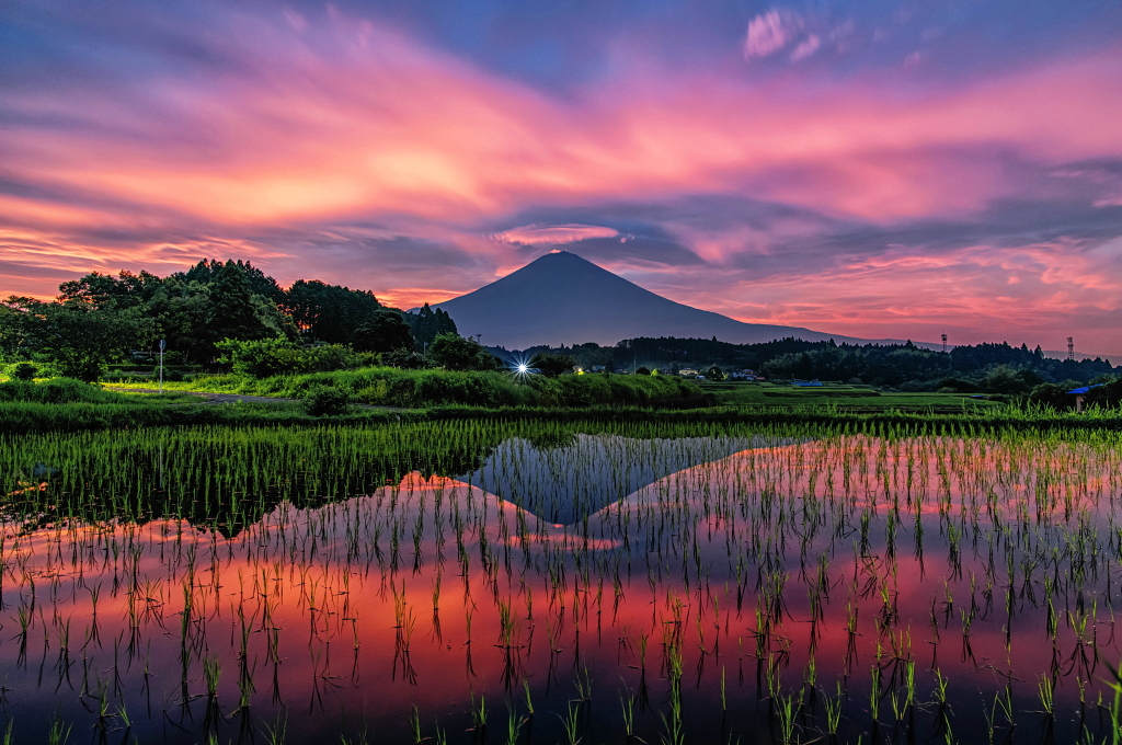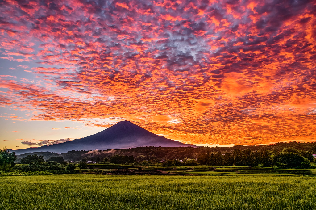 おはようございます。 里山の水田からの紅く染まる巨大吊るし雲を従えた富士山です!