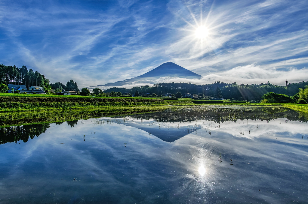 おはようございます。 のどかな里山からの水面に映る富士山と流れる雲の風景です!