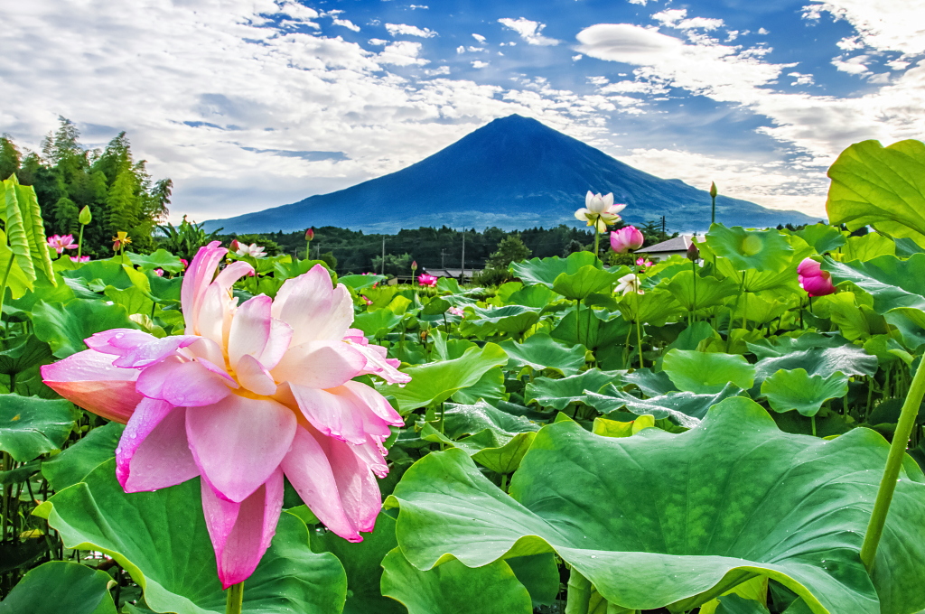 おはようございます。 里に咲く蓮の花越しに見る富士山と流れる雲の風景です。