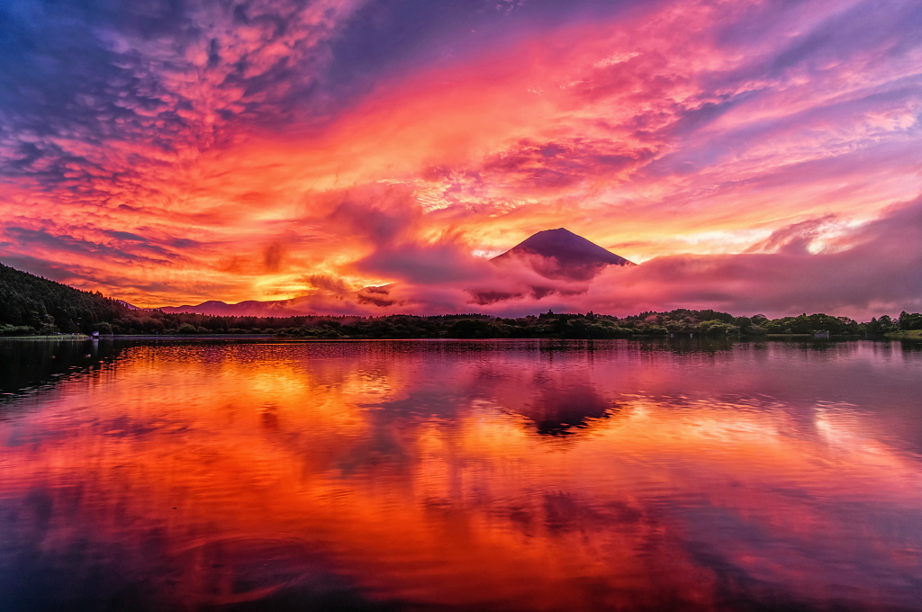 おはようございます。 逆さ富士映る湖畔からの朝焼け風景です!