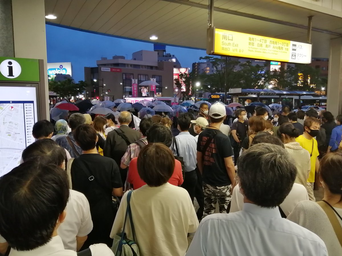 東京都知事選の山本太郎さんが亀有駅前で演説してる。雨だけどスゴい人が聴いてる😳