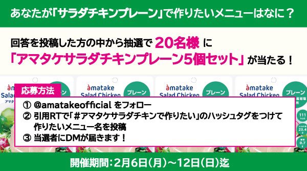 #アマタケサラダチキンで作りたい のハッシュタグをつけて作りたいメニュー名を投稿で当たる⁉️