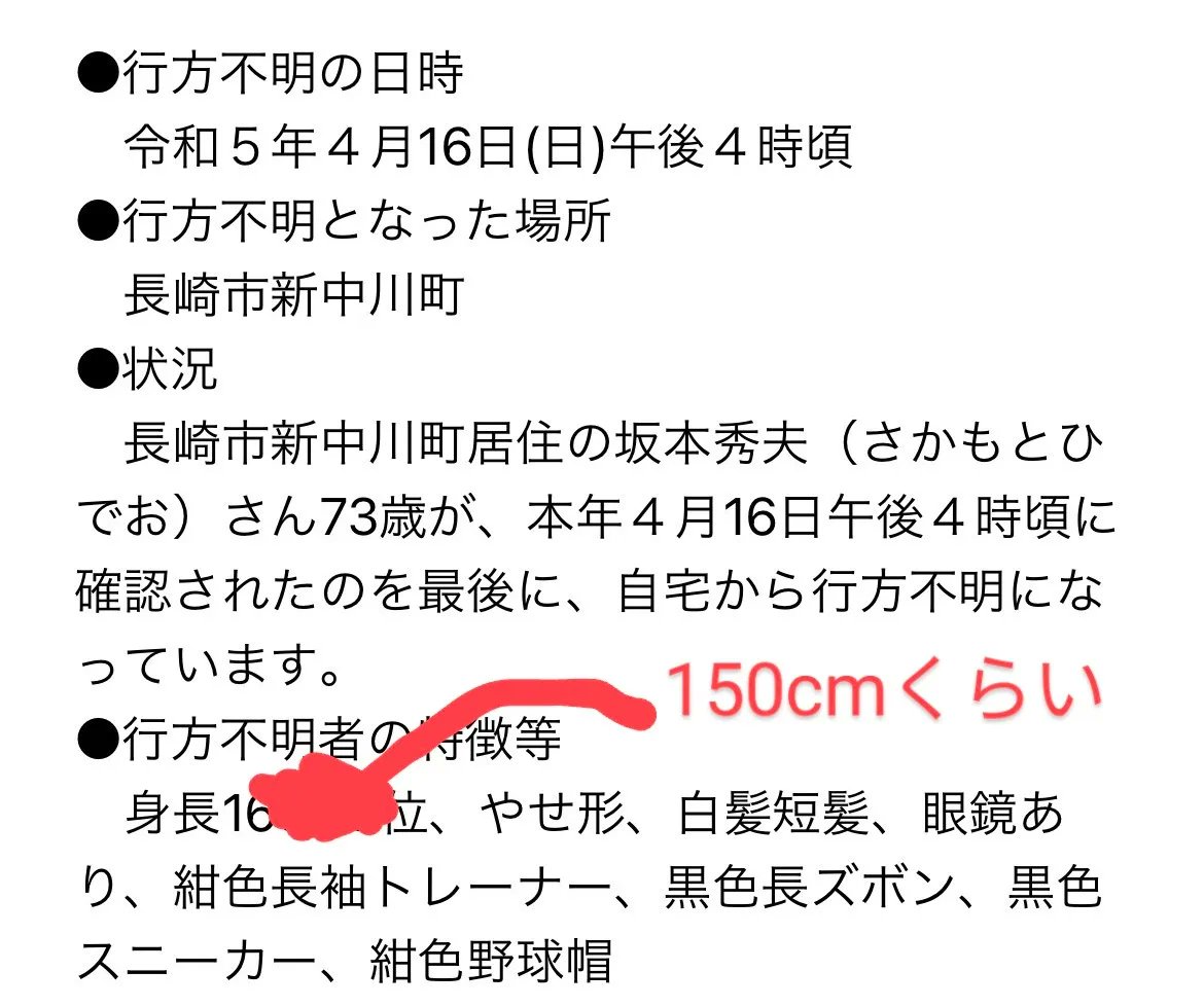 4/16午後4時から父が行方不明になりました。認知症を患ってますが体は丈夫です。携帯のみしか持たず散歩へ行きました(携帯は繋がりません)特徴などは写真1枚目をご覧下さい。 些細な情報でも構いませんので、見かけた方は長崎署へ通報して頂けると助かります。110番通報でも構いません。 つづく↓