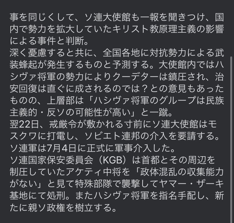 この後キリシタン勢力がCIAの援助のもと武装勢力「十字軍」として親ソ政権と内戦を繰り広げるのはまた別の話…