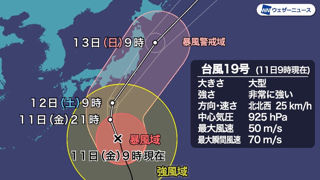 台風19号は非常に強い勢力で土曜12日夕方に東日本上陸見込み,