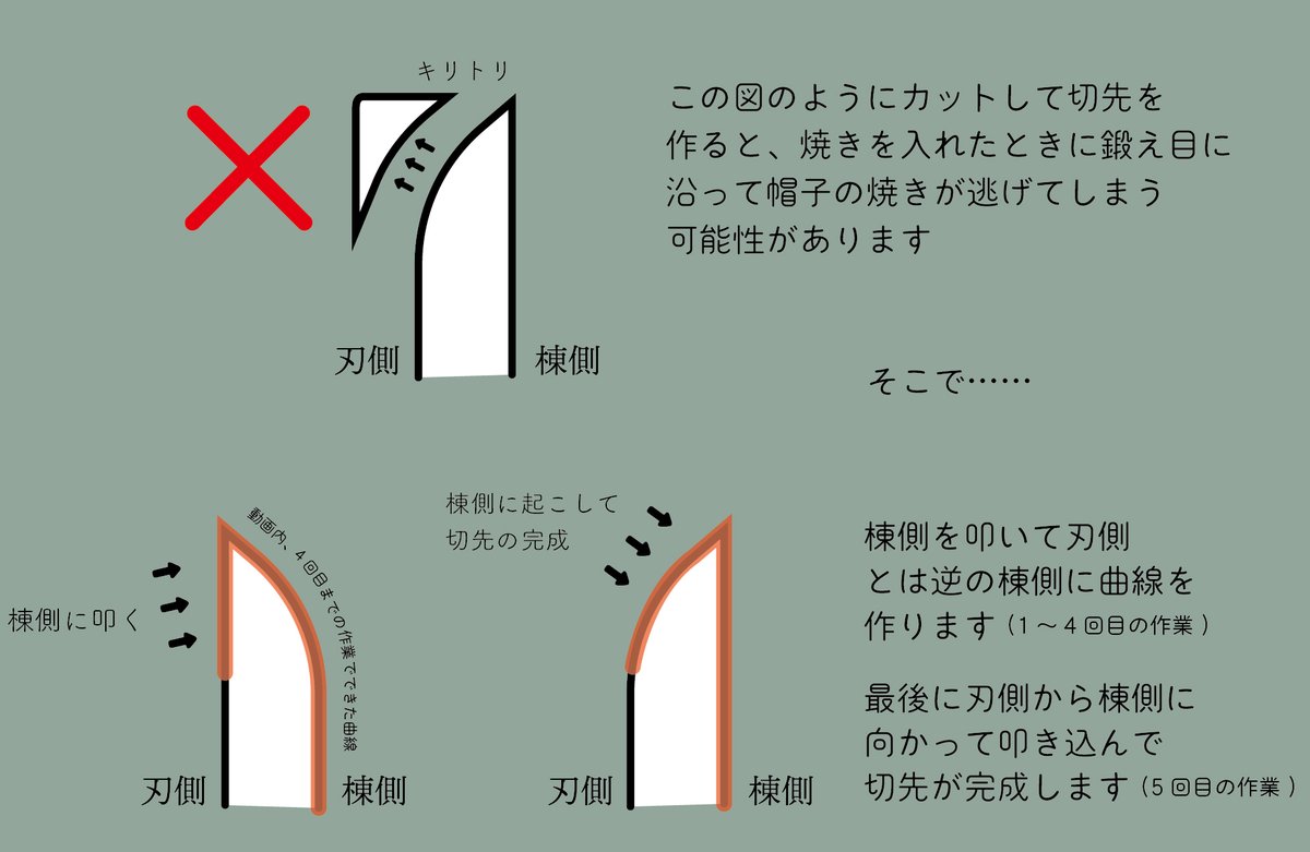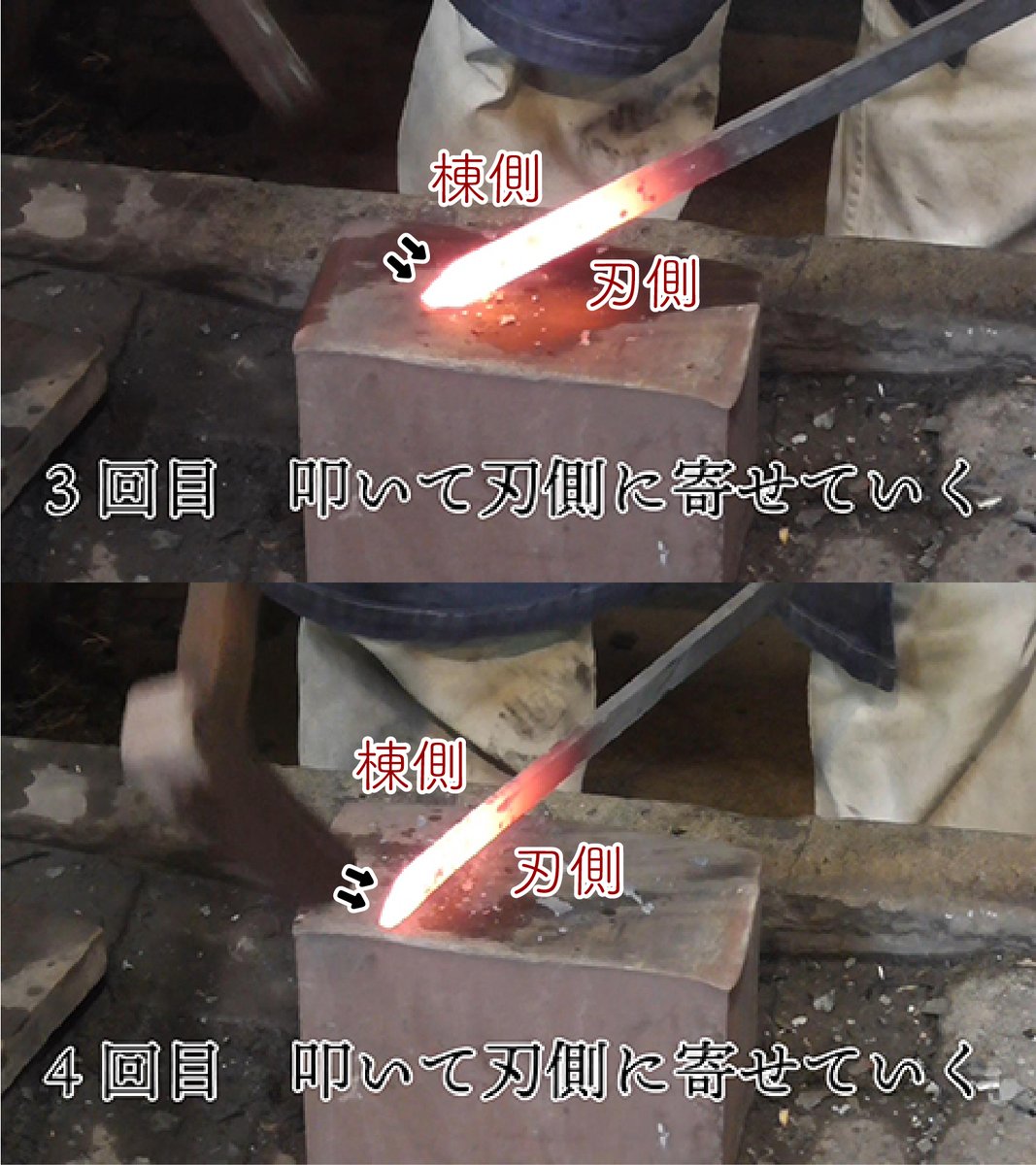 先日投稿した動画で、切先ができる瞬間をもう少し分かりやすく……というお声がありましたので、1~5回目の作業から画像を切り出して並べてみました。刃側に寄せた鋼が5回目の工程で一瞬で棟側に起きているのが分かるでしょうか? twitter.com/sanchomo_sup/s…