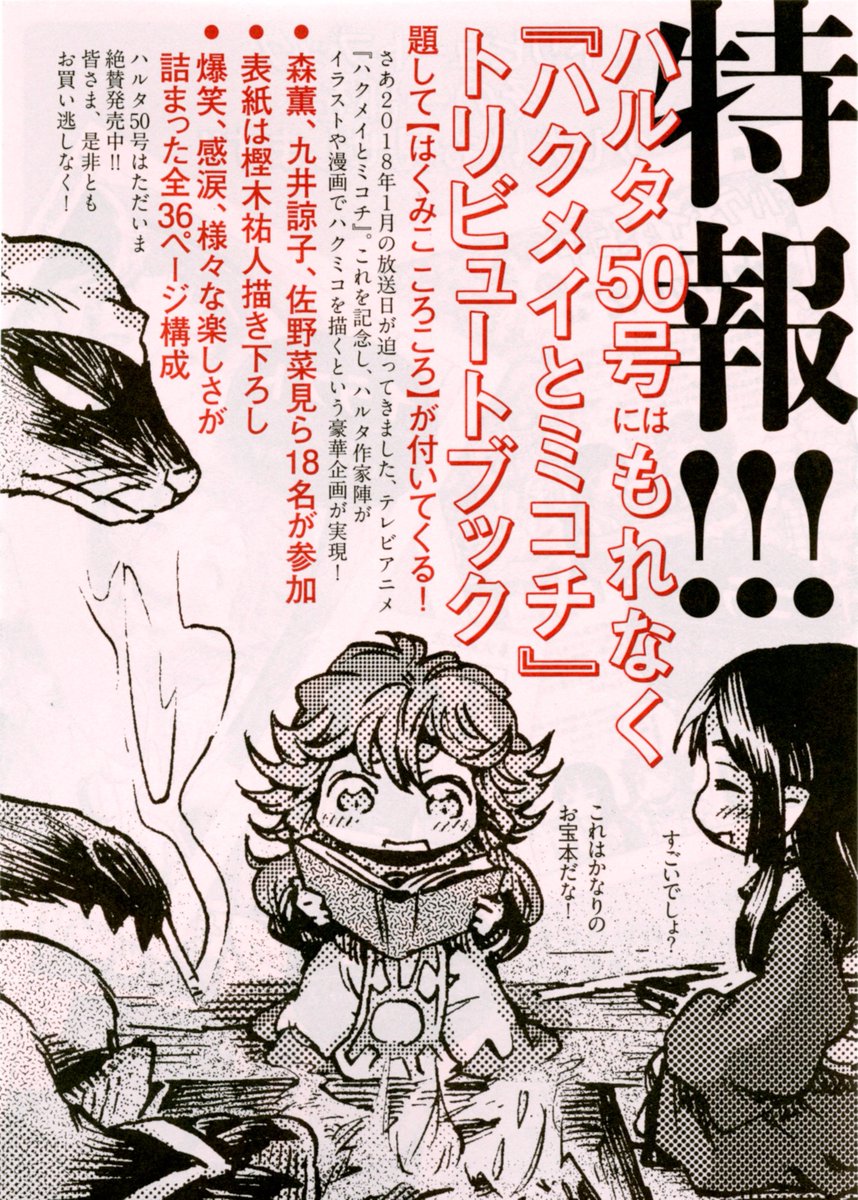 【ハルタ50号とじ込み小冊子のお知らせ②】ハルタ50号とじ込み小冊子「はくみこ ころころ」には、アニメが題材の新連載を開始する福島聡が描く、ハクミコの超短編アニメ(パラパラ漫画)も載ってます! パラパラめくりながら左ページの下を見るとハクメイがジャンプするよ!!