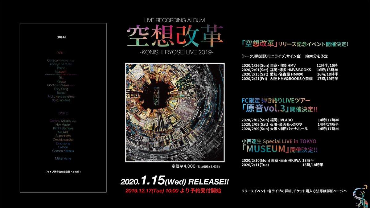 本日よりライブレコーディングアルバム「空想改革」一般販売開始!小西遼生オリジナル楽曲が、ライブの臨場感そのままに良質な音で体感出来るアルバムになりました。是非お楽しみください♪リリースイベントも是非♪