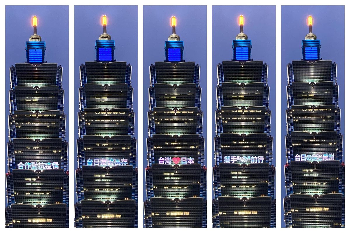 日本政府から無償提供されたコロナワクチンが4日台湾に到着。台北101の壁面に「台湾❤️日本」や「台日の絆と感謝」、「一緒にウイルスと闘おう」などのメッセージがともされました。