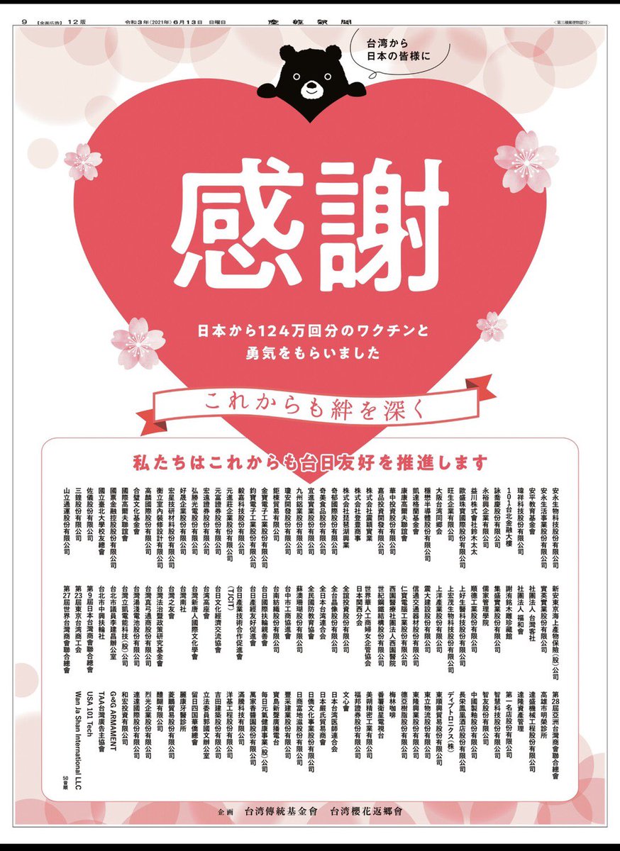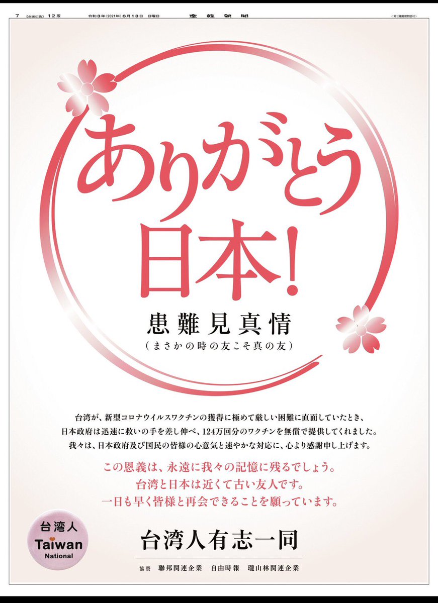 新型コロナウイルスワクチン124万回分を無償提供した日本政府と国民に対し、感謝の気持ちを伝えるため、約130の台湾系企業、団体などが6月13日付の産経新聞に「ありがとう日本!」などと題した2枚の全面広告が掲載。