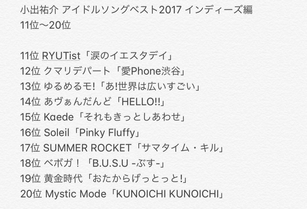 小出祐介 アイドルソングベスト2017 インディーズ編 11〜20位 #こんプロ