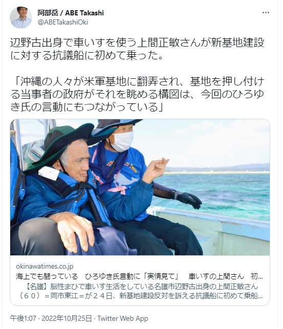 沖縄タイムス阿部岳さん、障害者を基地抗議ビジネスに利用しようとしてリアルビジネスマンに捕捉され感動4コマ漫画が完成してしまう。 twitter.com/ABETakashiOki/…
