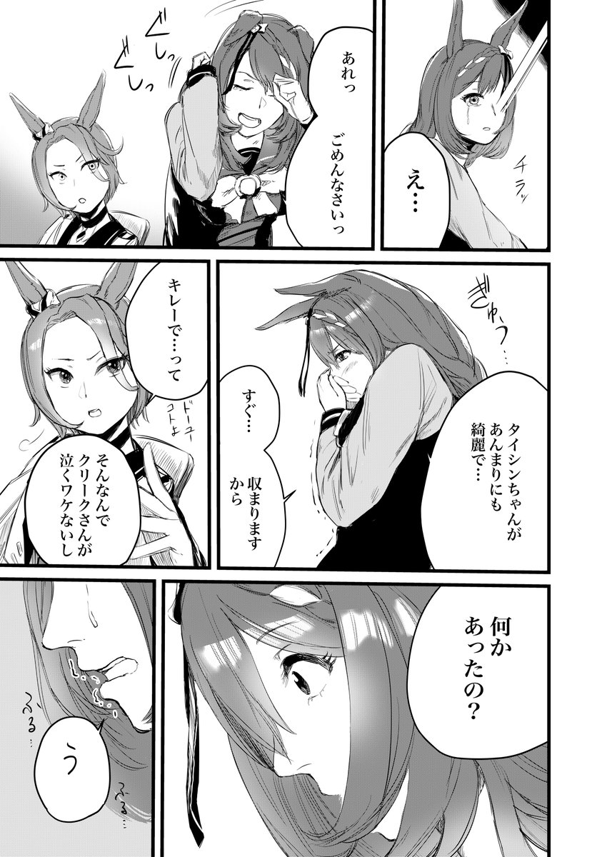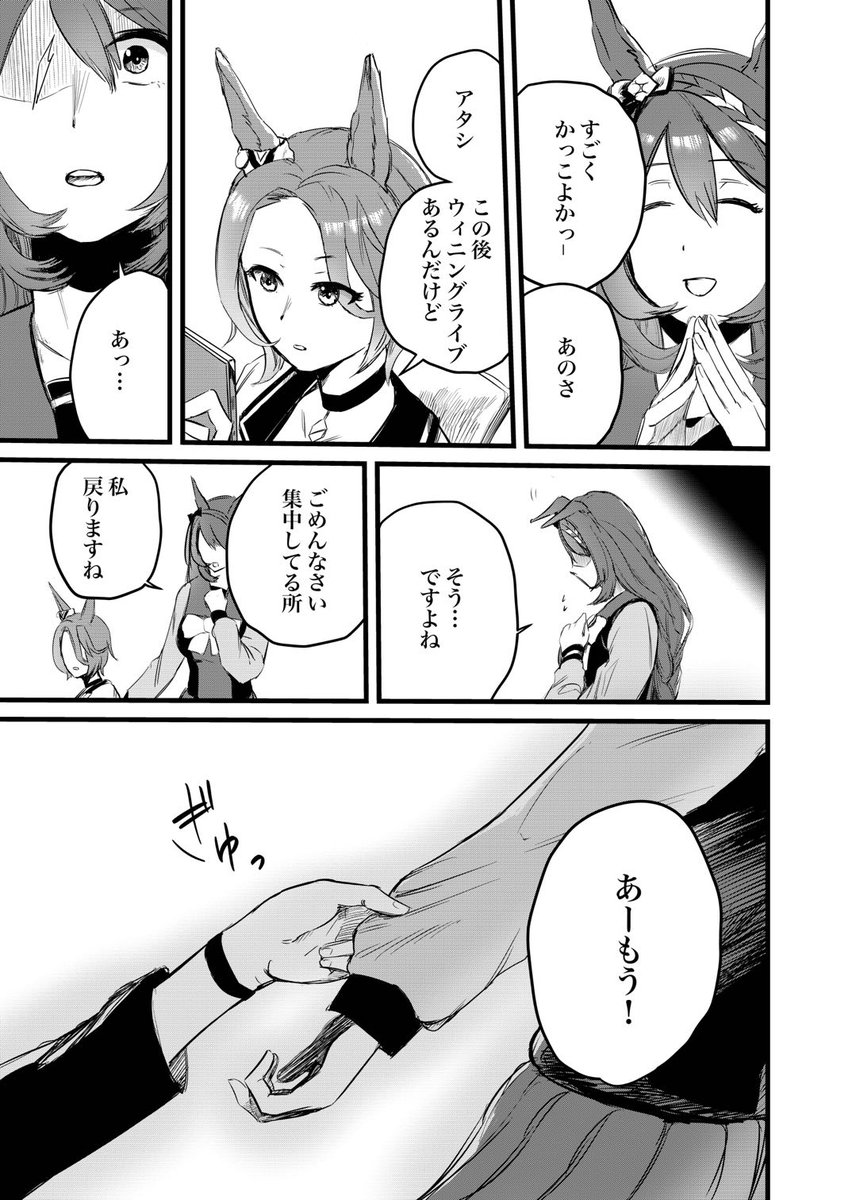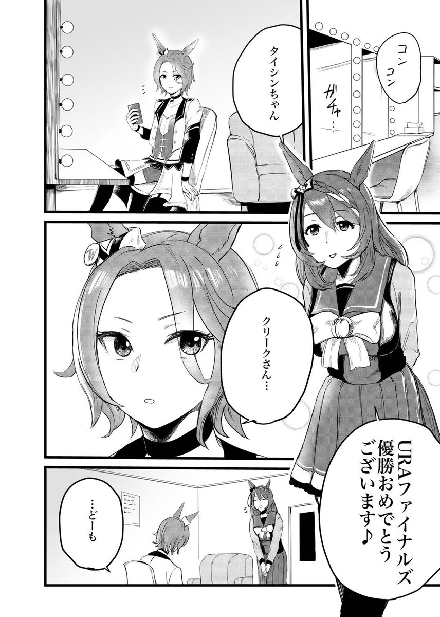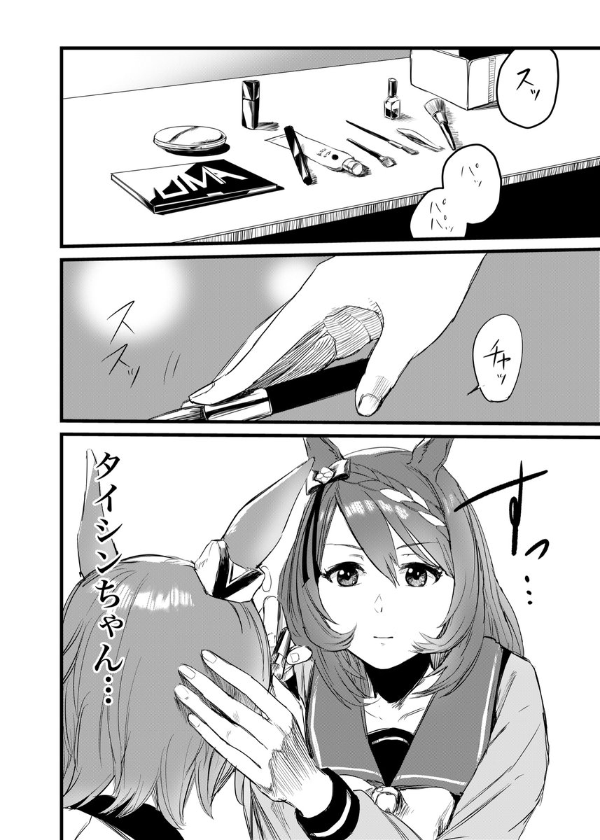 ナリタタイシンのウイニングライブ前にスーパークリークがメイクしてあげる漫画 「Side:Creek」(1/5)