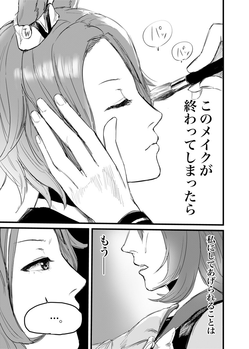 『伝説の幕間 Creekside』②5-8p ナリタタイシンがウイニングライブ前の控室でクリークさんにメイクを頼むお話です。