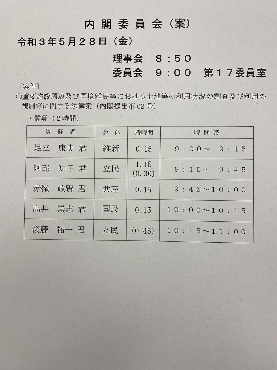 外交部会での議論と同じく中国の海警法に対する日本政府の対応が甘過ぎ、党として声を上げていこうということになりました(中略)
