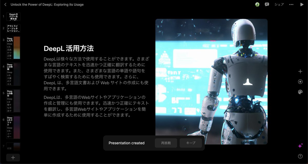 「DeepL活用方法」と入力しただけなんですが、添付画像のとおり7枚のスライドを文章・画像付きで作ってくれた