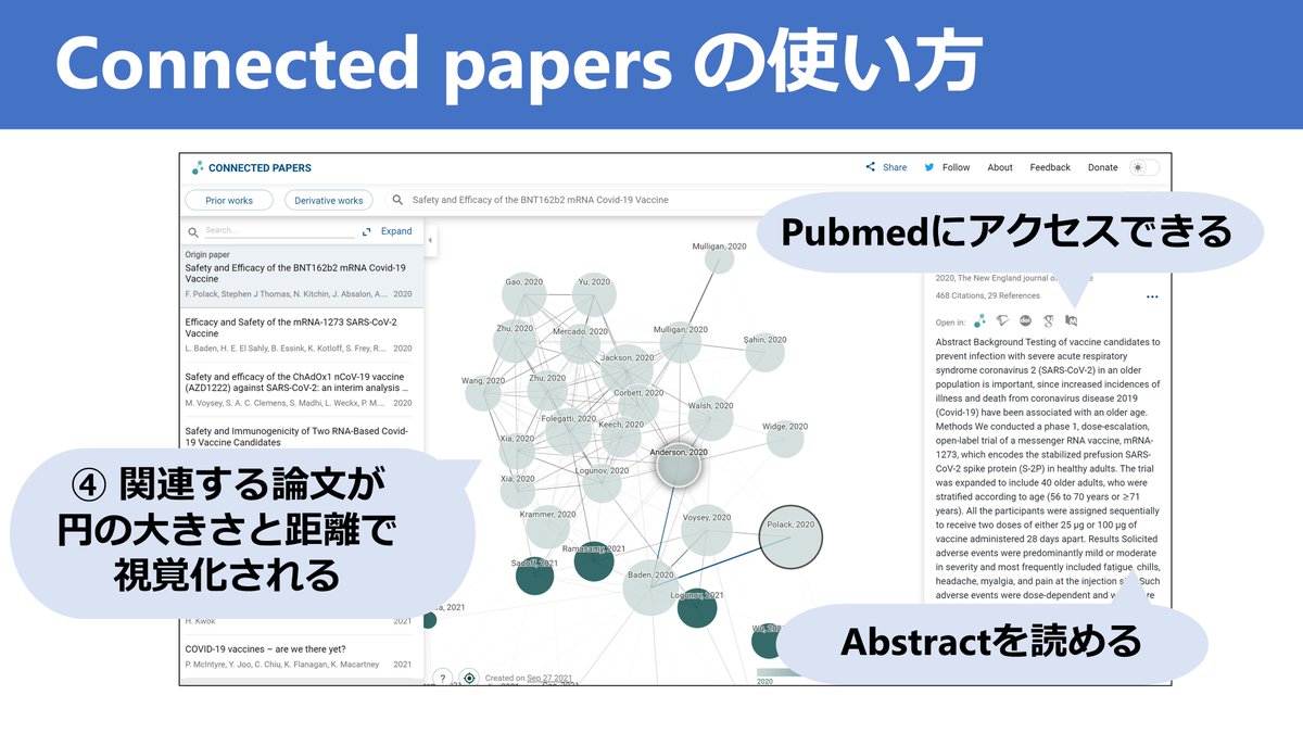 キーとなる論文を1つ入力すれば、関連性が高い論文が円の大きさと距離で表示されます。