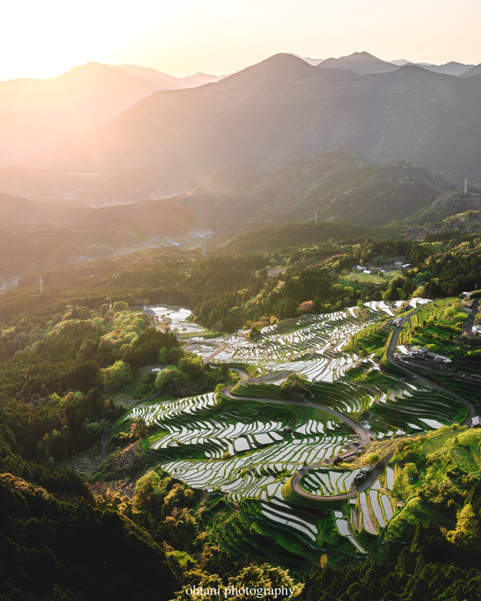 夕焼けの棚田とレーザービーム